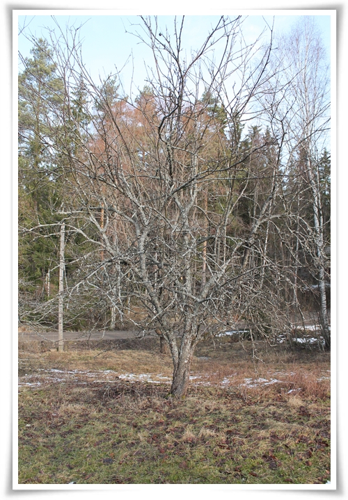 Det här är ett av de träd som vi inte hann beskära förra året. Däremot vågar jag inte svära på att det är ett äppelträd. Det skulle kunna vara krikon istället.