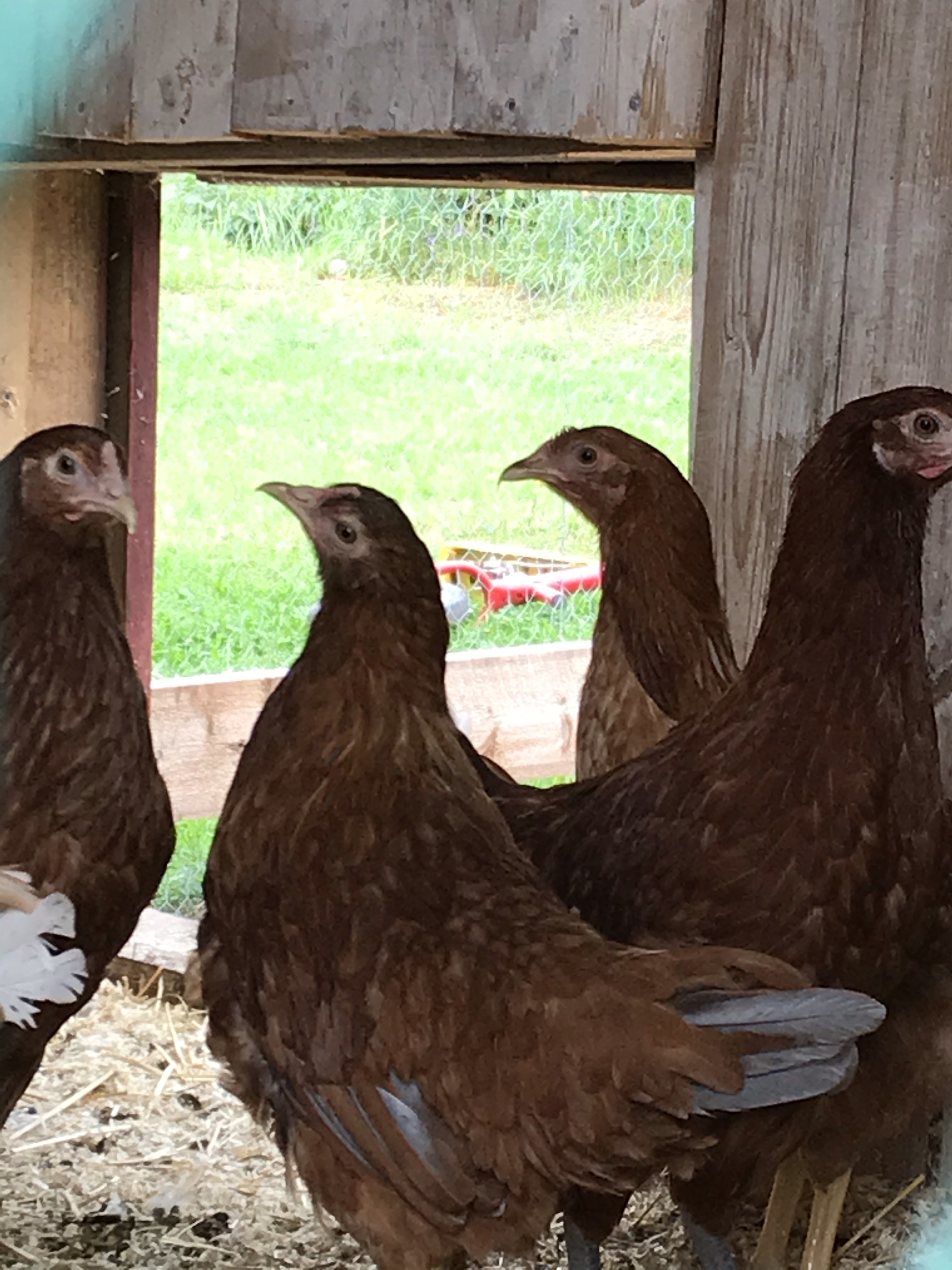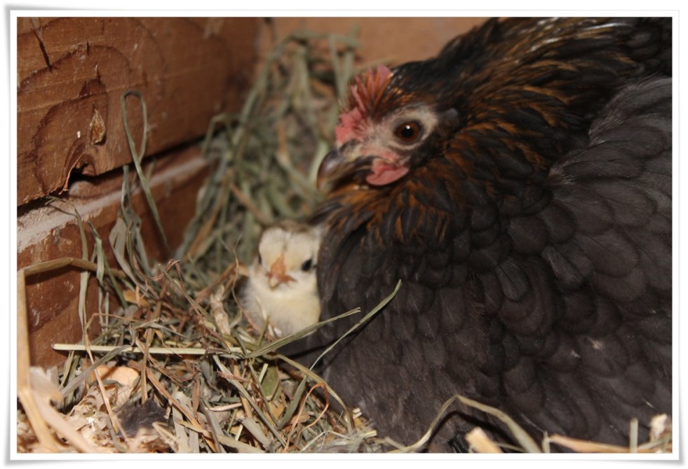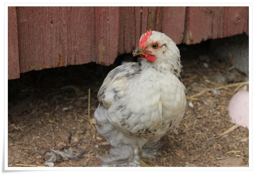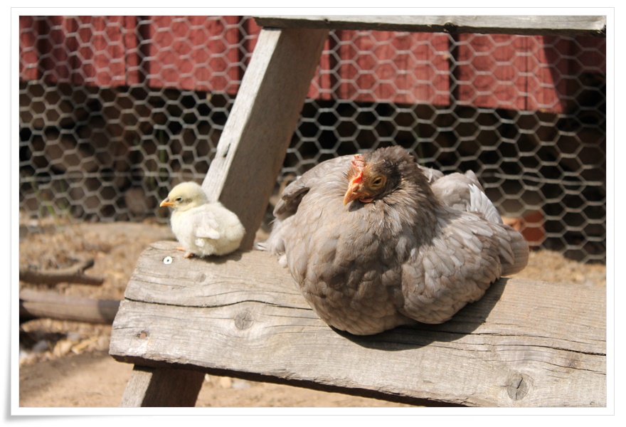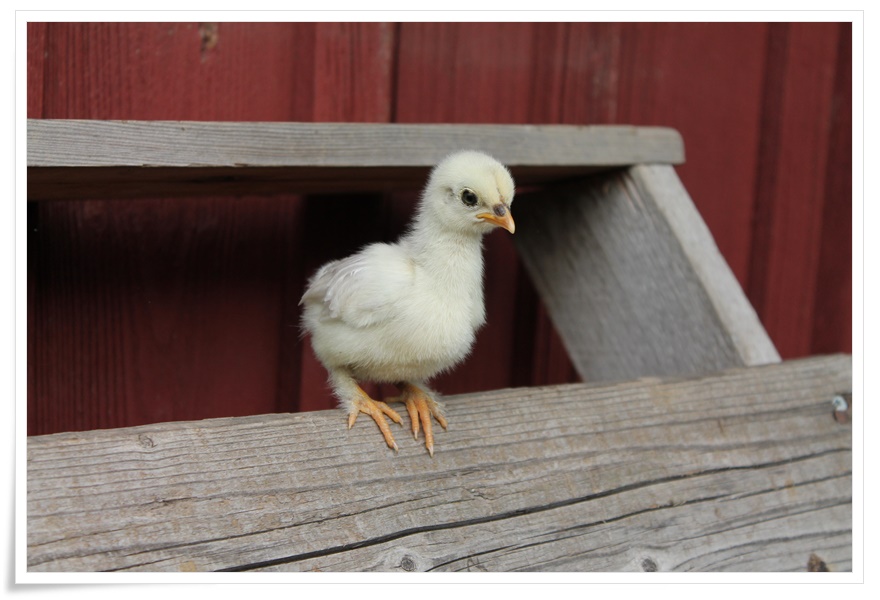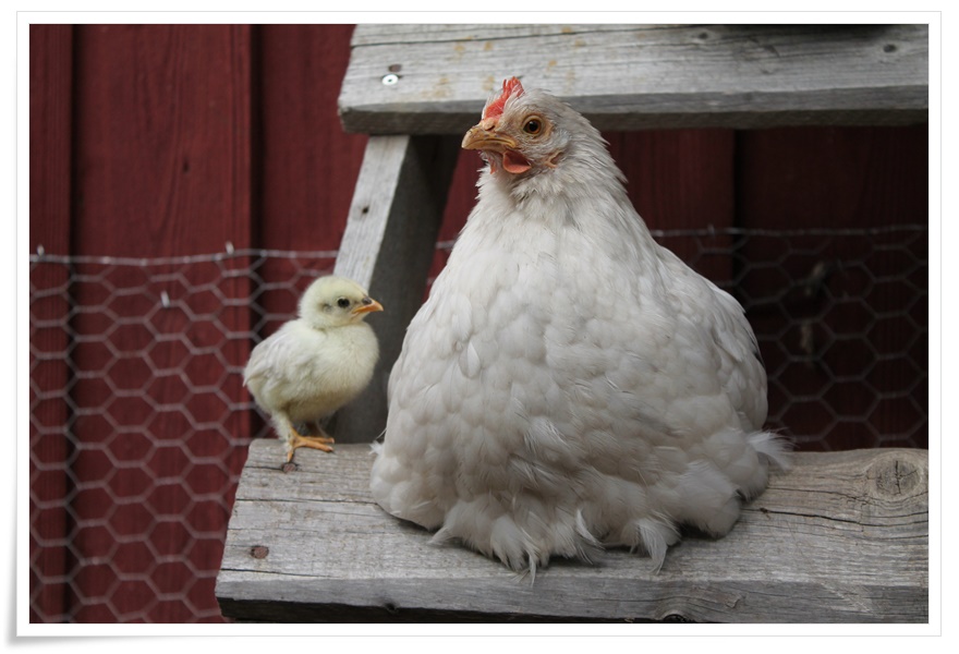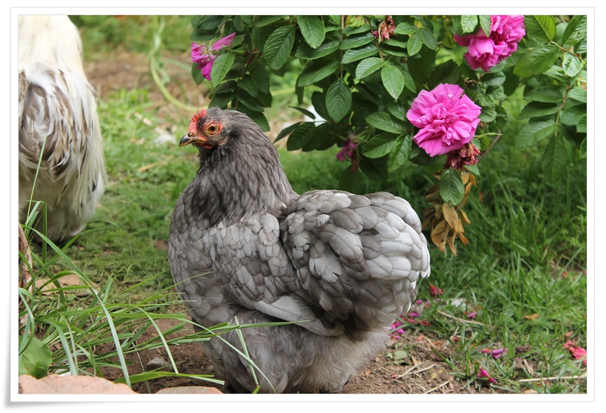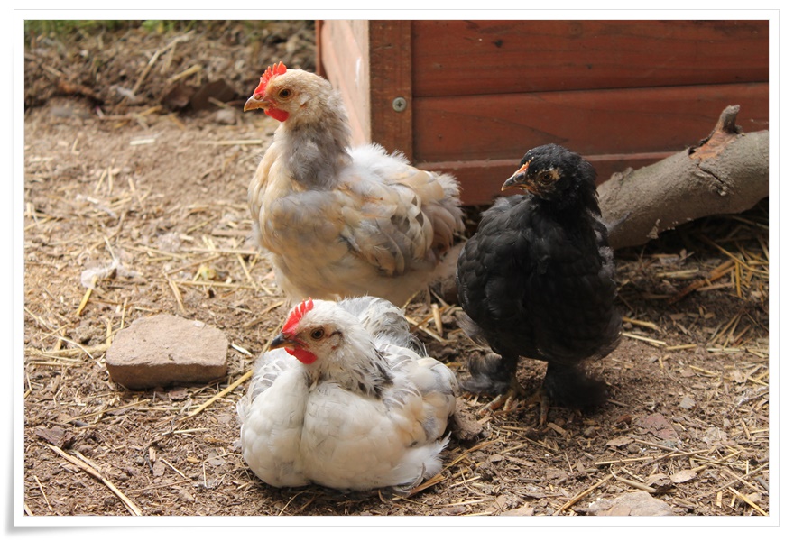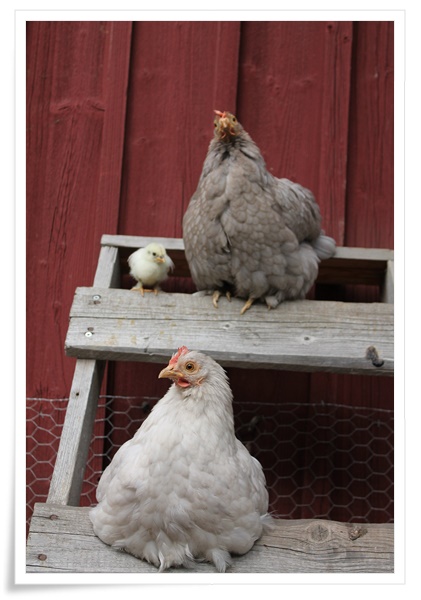 Som nästan alltid går jag sedan ner till hönsen. Kycklingarna som kläcktes i våras är redan stora. Av de två som Pipis och Lilla Grå ruvade på var det, som ni vet, bara en som klarade sig. Vi kallar den för Lucky efter en smärre incident. En kväll höll hönsen nämligen en helt ny nivå på sitt kränkta kackel, så till den grad att både jag och maken reagerade. När maken gick ut för att se vad som hänt var Pipis och Lilla Grå i upplösningstillstånd (och det krävs egentligen inte mycket för att komma dit, i går var allt som krävdes en varmluftsballong hundratals meter ovanför) och när han kommer runt hörnet möter han en lätt nervös Rasputin med munnen full av fluffig kyckling. Efter en vild jakt lyckades så maken bända tillbaka kycklingen ur munnen på Rasputin, som synnerligen förnärmad gav sig av. Det visade sig att Lucky var liten nog att helt enkelt knata rakt igenom nätet runt hönsgården och att Rasputin förmodligen varit opportunist snarare än jägare. Hur som helst. Lucky klarade sig med blotta förskräckelsen och fick sedan inte gå ut ur hönshuset på över en vecka. Sedan igår får hen dock komma ut tillsammans med sina mammor, och det njuter de av alla tre.