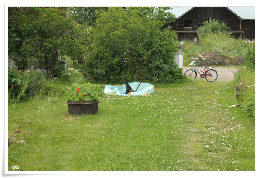 På gården står en pool. I den finns en gräsklippare i plast och en katt.