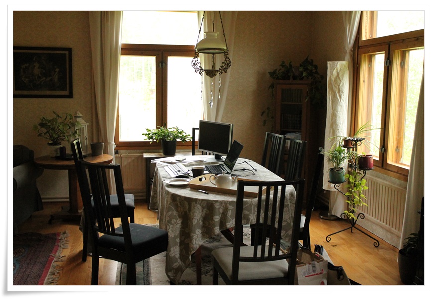 Ibland känns det som om jag skryter när jag lägger ut bilder på vårt hem. Jag är nämligen så oförskämt superdupernöjd med att bo här. Ja, och egentligen är så det ju på många sätt ett ruckel, det är bara det att liksom är vårt ruckel och att jag aldrig har älskat ett ruckel så mycket i hela mitt liv. Om ni förstår. Dessutom tänkte jag att det säkert skulle bli trist att titta på bilder hela tiden, men så besökte jag Tant Ninettes fantastiska blogg och insåg hur mycket jag njöt av att se hennes bilder och tänkte att jag bara helt enkelt skulle lägga upp dagens skörd. Så. Kidsen är med sin pappa ute på ön och jag sitter hemma själv och jobbar i salen. Salen går inte att fotografera för det är för ljust ute och för mörkt inne (har knappt några lampor här, bara en temporär).