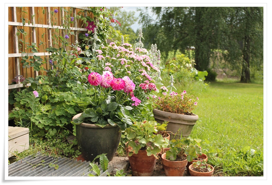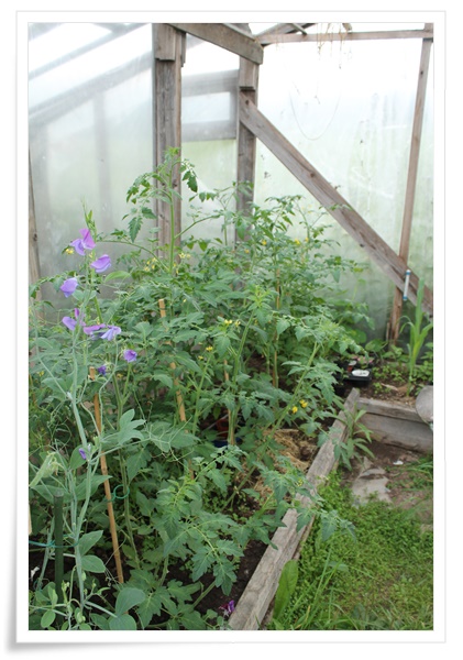 På växthusets större sida kommer tomater, om än inte i riktigt samma mängd som förra året. Här står också solhatt i krukor och väntar på att bli utplanterade i rabatten.