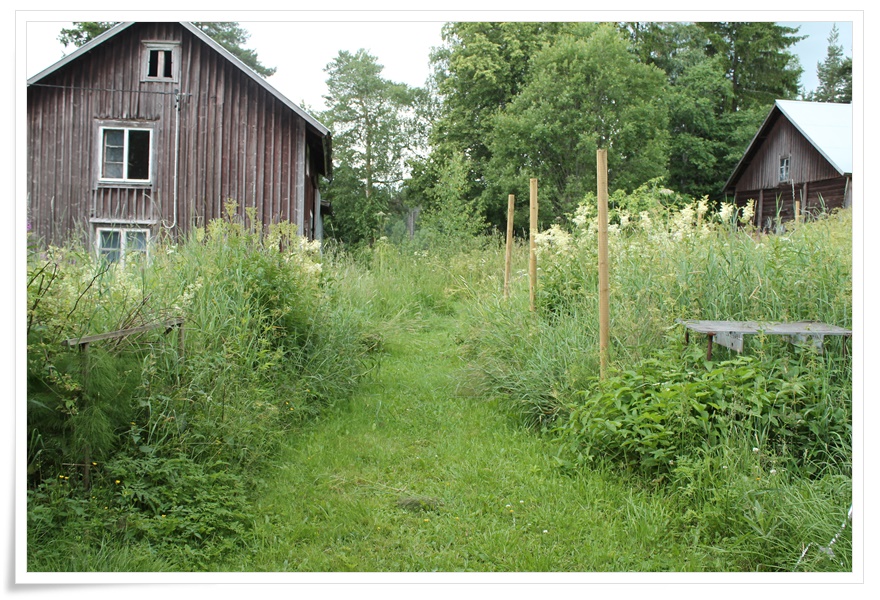 Den här stigen leder från hönshuset bort mot snickarboden (till vänster) och ladugården. Pinnarna till höger ska i något skede bli en större hönsgård.