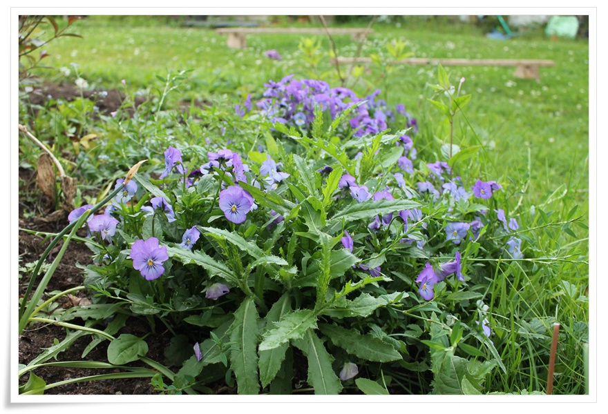 När jag köper penséer (vilket jag gör i kopiösa mängder på våren), brukar jag peta ner dem i rabatten när de ser ledsna ut i krukan. En del sorter är perenner och tar sig som tusan. De här är från förra året. Tistlarna ska jag rensa bort en dag. Sedan.