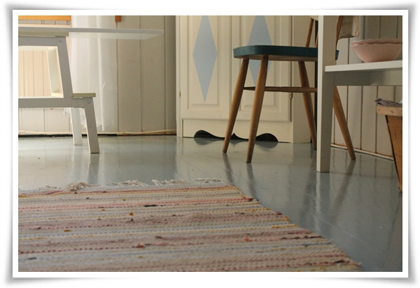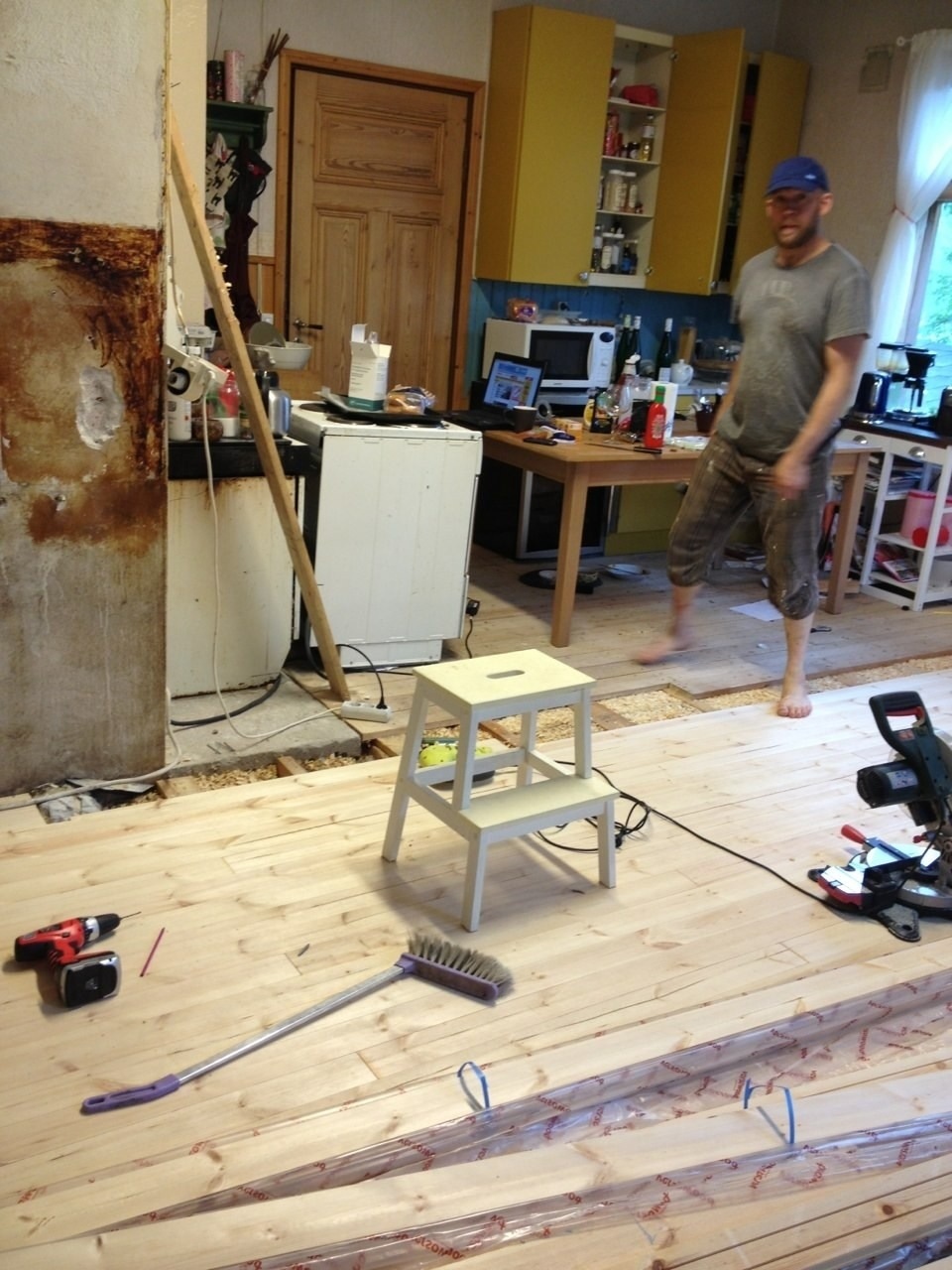 Maken håller på att lägga in nytt golv. Det är ett obehandlat spontat trägolv som sedan ska målas för att matcha golvet på den första bilden. Som jag alltså står på för att ta den här.