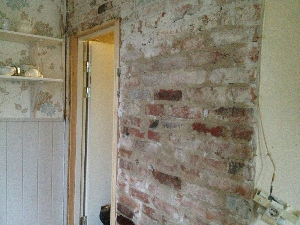 Vi beslutade oss för att inte rappa väggen på nytt utan behålla teglet. Eftersom det dammade något så vansinnigt, även efter att byggaren lämnat över till mig var det första jag gjorde att dammsuga väggen, sedan tvätta den och därefter måla den minutiöst med en primer (ett sorts lim). Primern binder dammet, och det sitter som berget – inte minst för att primern skulle blandas med vatten i ration 1/5 och jag kanske eventuellt läste lite slarvigt och tog fem delar primer istället för fem delar vatten.