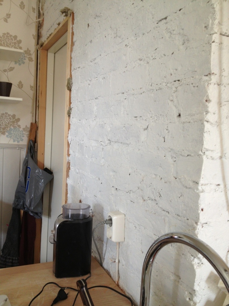 Vi har ju jobbat med köket i sektioner, eftersom det är så stort (typ 35 kvm) att vi inte riktigt kan tömma hela på en gång. Vi har också byggt hela köket själva (förutom el och vatten då förstås) så det har blivit rätt sena kvällar för att komma framåt. Väggarna har jag ju tapetserat (men det är alltså inte heller färdigt), men två av väggarna – som vetter in mot pannrummet – var rappade. Vår tanke var att de skulle målas. Vår tanke var att de skulle vara ”de lätta väggarna”.