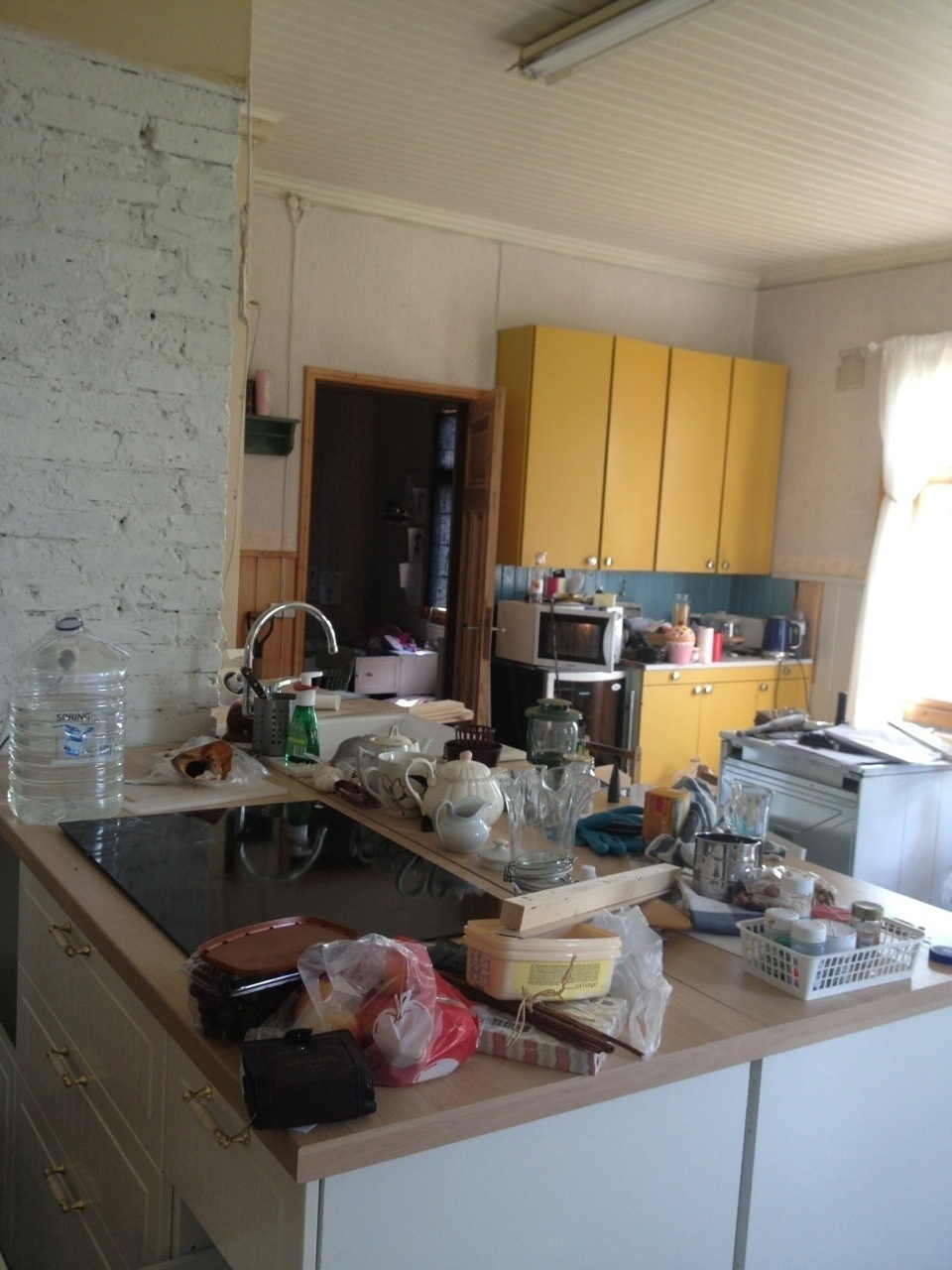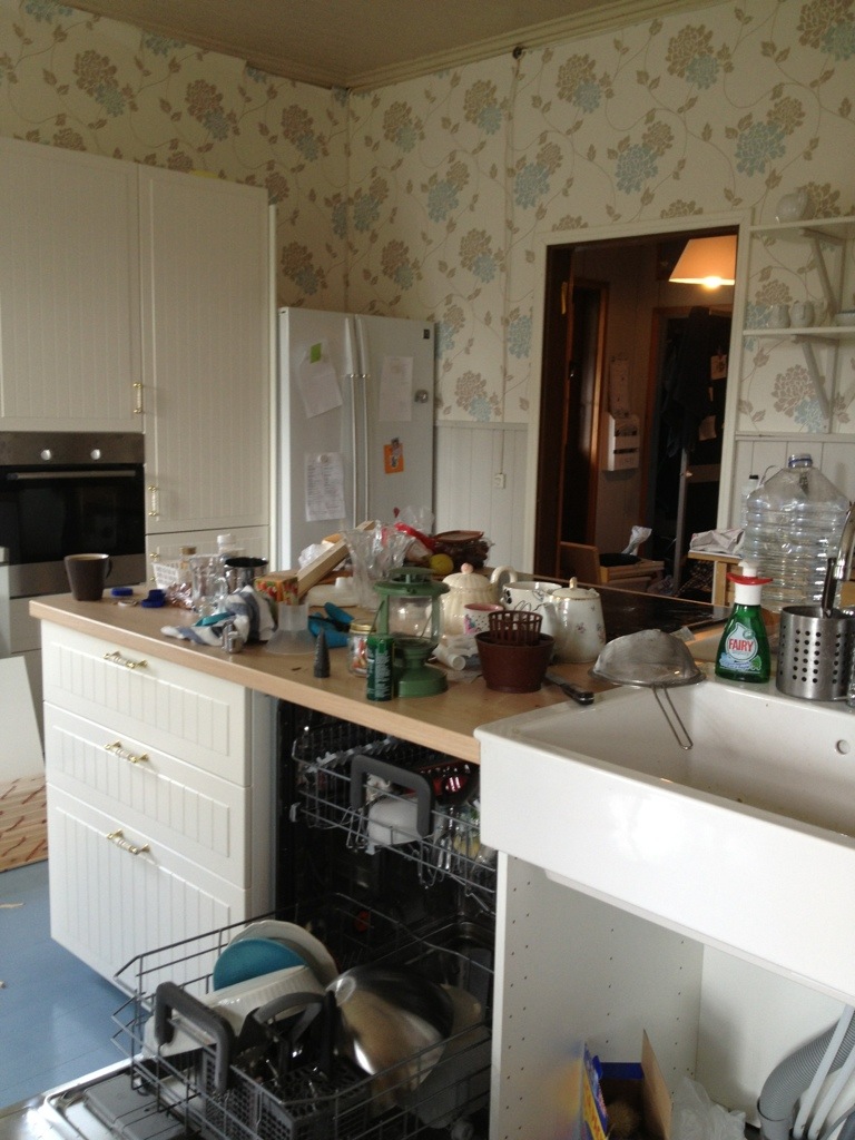 Så fredag såg köket ut så här med en telefonkamera, i all sin ostädade glans: