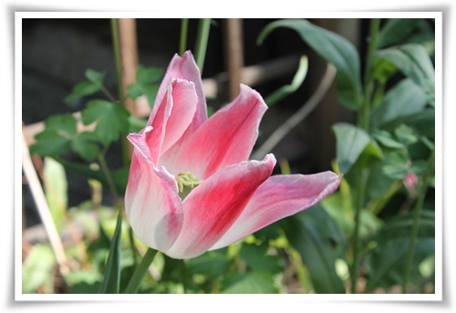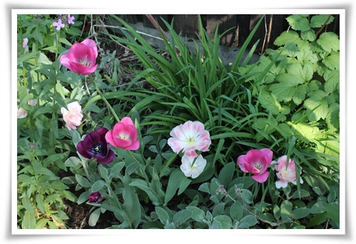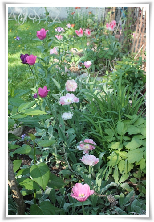 Tulpaner blir det också en hel del. Jag hade ingen vas, så de här står i en avskuren pet-flaska med ett sidenband på. Så nära DIY-pysselblogg vi kommer att komma, så se det som ett exklusivt pysseltips. Stolen hittade vi på vinden, och den lilla skålen är en emaljerad skål tillverkad i Jugoslavien anno dazumal. Hittade den på Sisustus Ometta.
