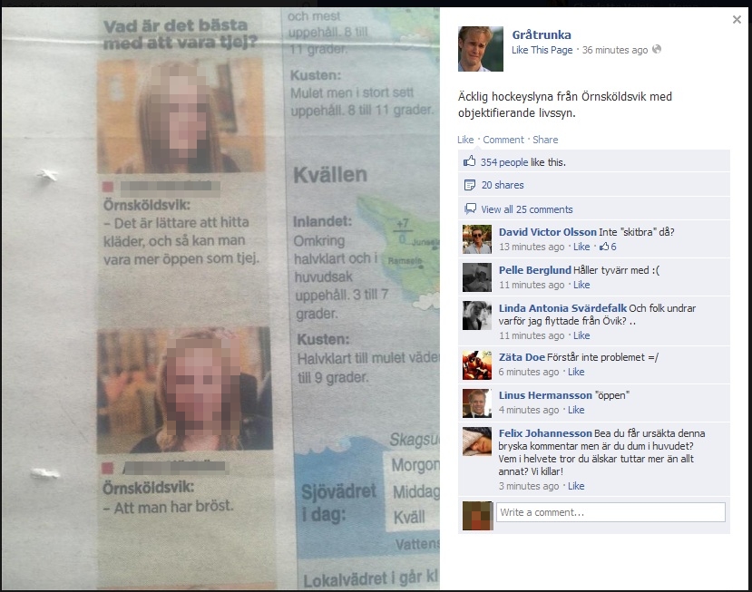 Här i Finland finns det en svenskspråkig radiokanal för ungdomar, som kallas Radio X3M. Jag brukar lyssna ibland, inte för att jag riktigt ingår i deras målgrupp kanske, utan för att de i allmänhet spelar bäst musik. Och så i torsdags, på väg för att hämta barnen från några kompisar, lyssnade jag på två män på X3M som diskuterade ett fall i USA med sexuella trakasserier av en trettonårig flicka. De började med att berätta hennes namn (som jag inte minns, och heller inte har för avsikt att upprepa) och sedan hennes berättelse om hur hon blev mobbad i skolan för att hon hade så stora boobs, om hur hon dagligen blev utsatt för sexuella trakasserier, om hur hon och hennes mamma hade gått till rektorn(?) för hjälp och råd. Och om hur rektorns svar blivit att det knappast skulle löna sig för den här trettonåringen att byta skola för med sådana boobs skulle hon säkert bli mobbad vart hon än kom och att skulle man inte kunna överväga en bröstförminskning istället.